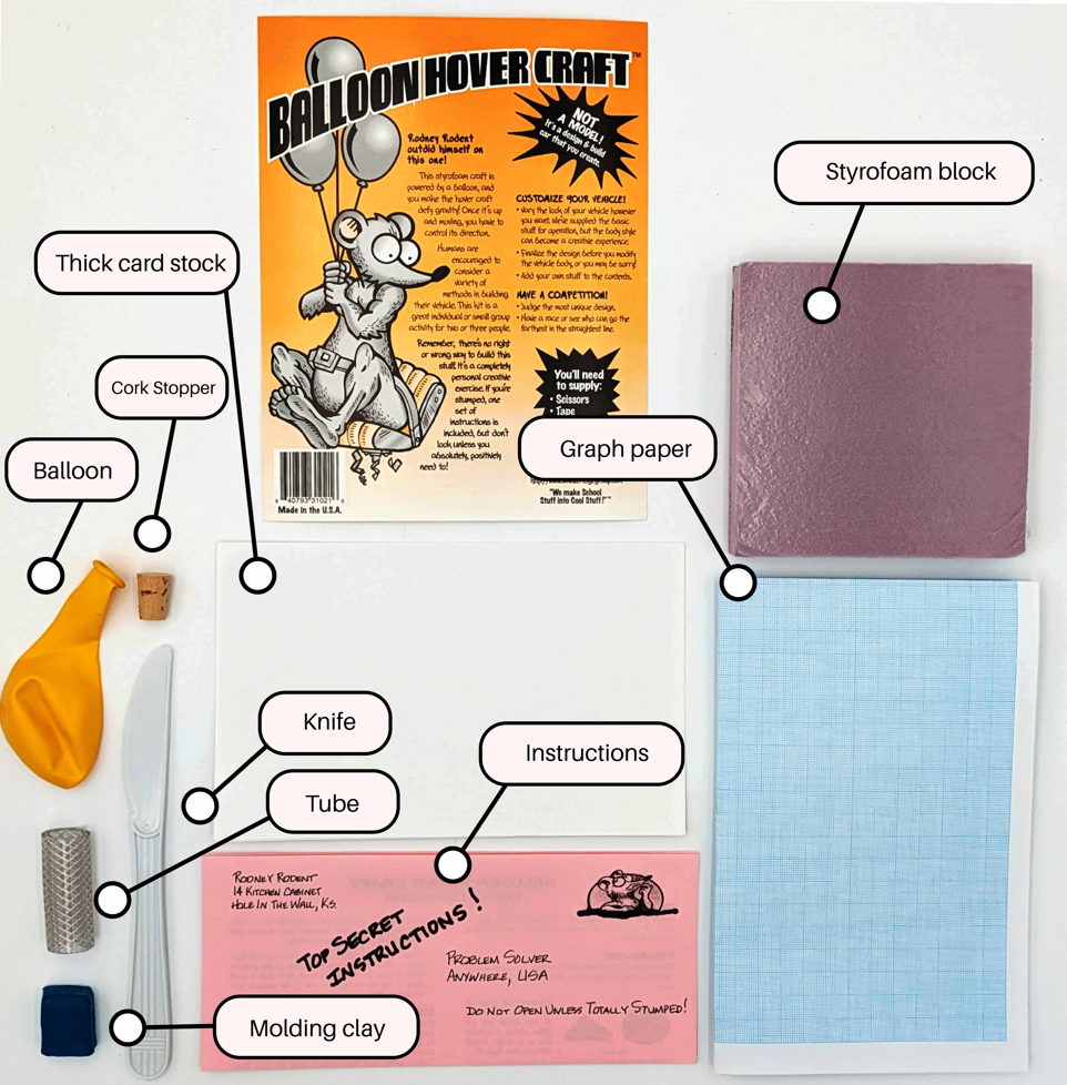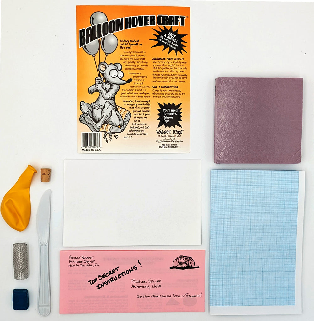This is a fun and challenging kit. Make the balloon power the Styrofoam square on a cushion of air! It's tricky, but you can do it. Requires placing the hovercraft on a flat, smooth surface to work correctly. Includes Styrofoam blank, balloon, fins and other hardware (Ages 10 & up). This is a fun and challenging kit. Make the balloon power the Styrofoam square on a cushion of air. Requires placing the hovercraft on a flat, smooth surface to work correctly.