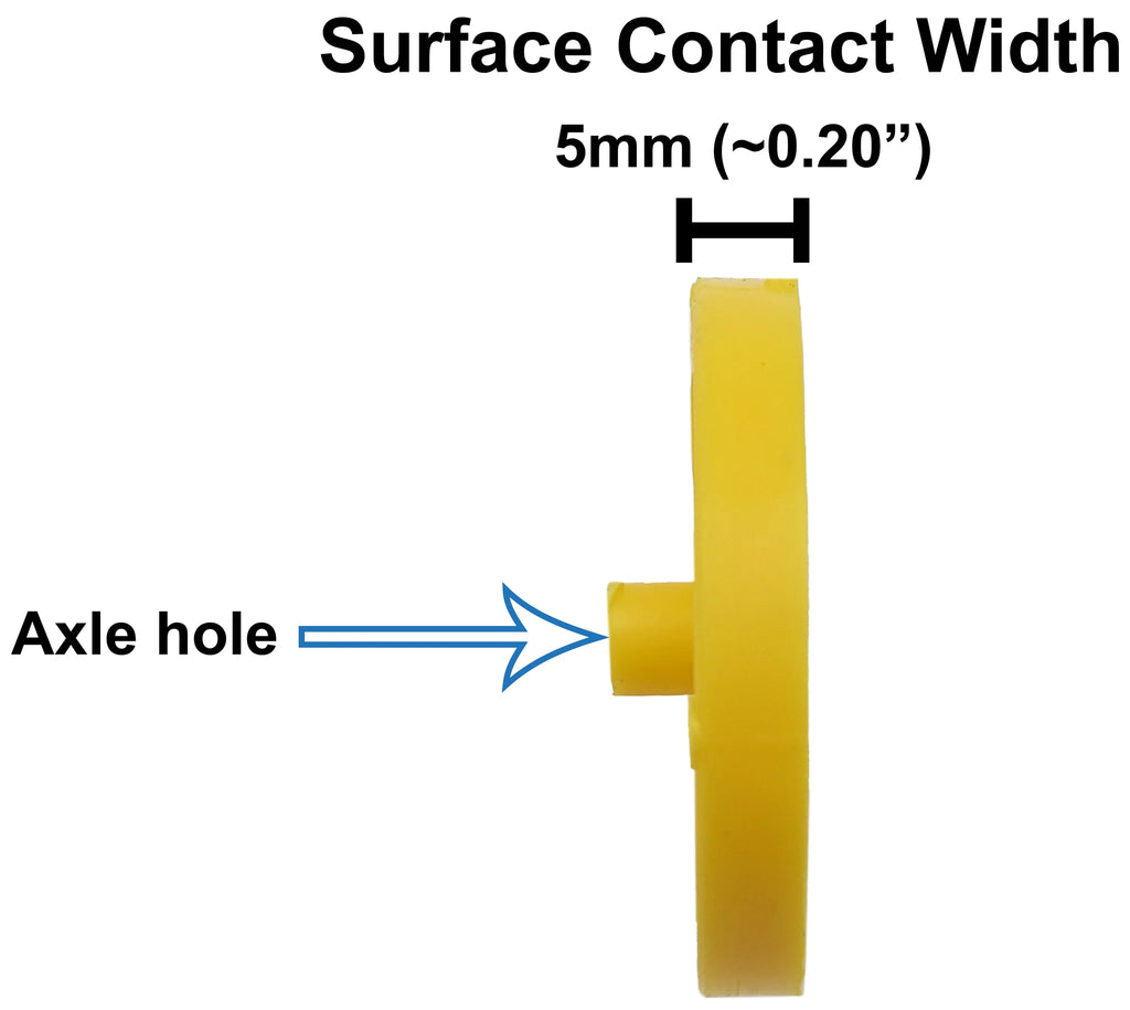 Each wheel is made of durable polypropylene, constructed in one piece, and features an axle hole that fits a 1/8" diameter axle (axle not included). Note: The axle hole is only on the inside (doesn't go all the way through the wheel).