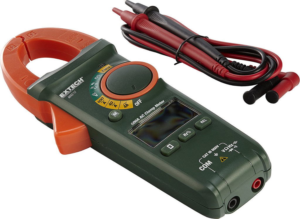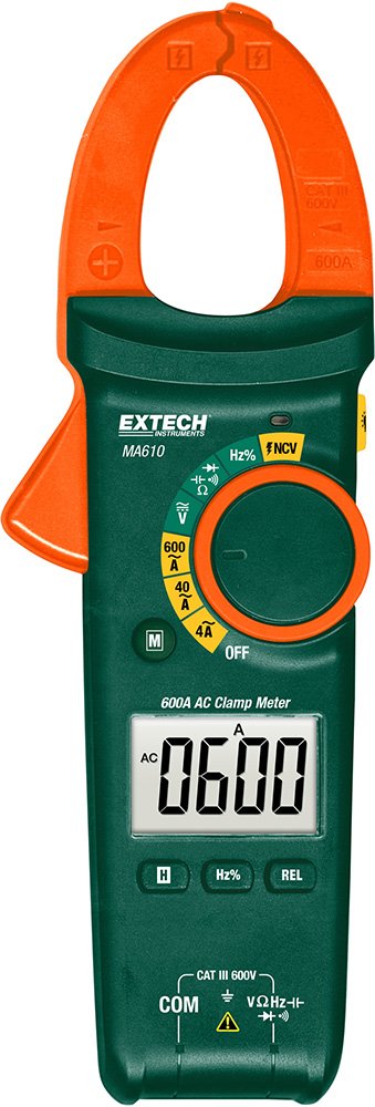 The MA610 is a fully loaded clamp meter with multimeter functions including AC Current, AC/DC Voltage, Resistance, Frequency, and Capacitance. It also has a built-in non-contact voltage (NCV) detector to quickly check circuits and wires for live voltages. It’s a pocket-sized meter with 1.2" (30mm) jaw that fits conductors up to 500MCM and is designed with a large backlit LCD display to view in dimly lit area.