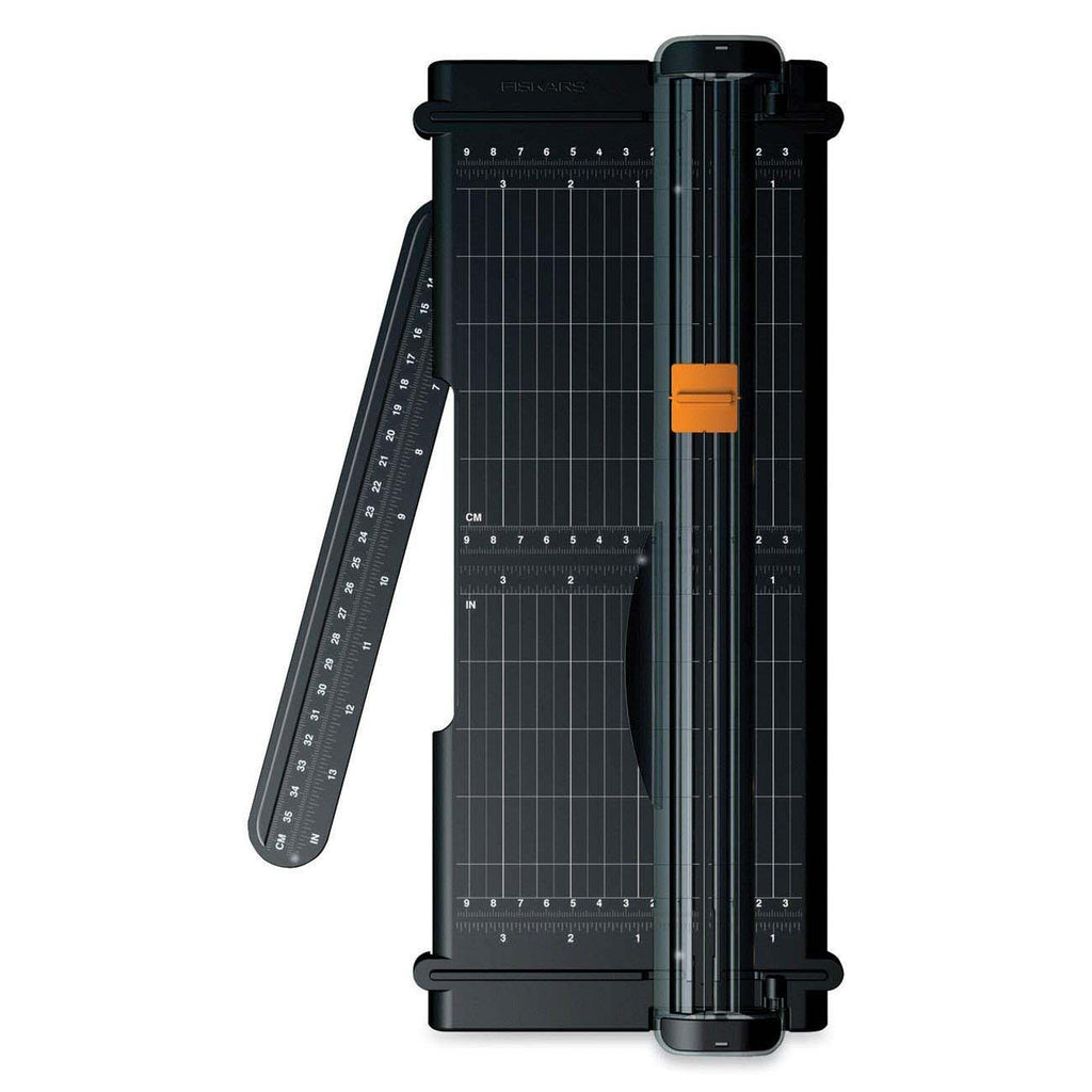 Compact, lightweight trimmer is ideal for trimming photos, coupons and office paper. Surecut wire cut-line allows you to quickly and easily align paper for clean, accurate cuts. Titanium blade coating is three times harder than steel and cuts up to seven sheets at a time. Triple Track system holds blade securely for straighter cuts. Swingout arm extends measuring length to 14-1/4". Portable paper trimmer also features a precision-printed grid. and scale.