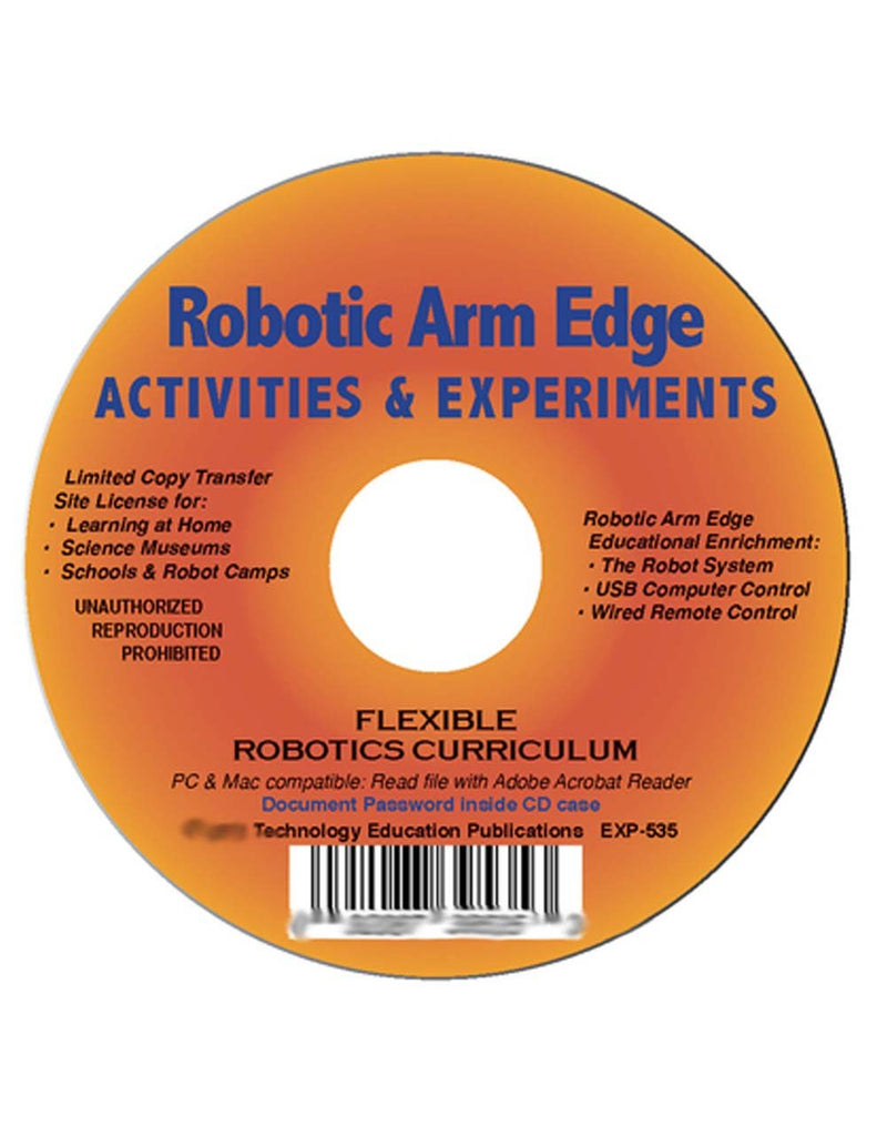 This CD curriculum provides multiple step-by-step activities and experiments for the Robotic Arm Edge robot in both manual and computer control modes. Students are challenged to measure and record robot specifications, perform experiments, solve problems, record data, reflect about their activities and answer questions in each robot lab activity. Using the site license that comes with the product, directions may be read off a computer screen or made into printed masters and copies. This curriculum when combined with the Robotic Arm Edge creates numerous and flexible educational opportunities for students. Answer keys provided. This is a flexible robotics curriculum for individual student use, home schools, science museums, and schools. CD is Mac and PC compatible.