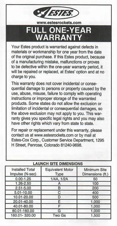 Please verify that these engines are compatible with your model rocket before purchasing.This product is warranted by Estes against defects in materials or workmanship from one year of the original purchase. Please retain the warranty information included in the package so that you may reference it in the event that you receive a defective or malfunctioning product as the engines are not returnable by mail.