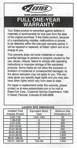 Please verify that these engines are compatible with your model rocket before purchasing. This product is warranted by Estes against defects in materials or workmanship from one year of the original purchase. Please retain the warranty information included in the package so that you may reference it in the event that you receive a defective or malfunctioning product as the engines are not returnable by mail.