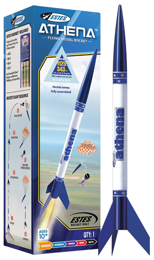 The Athena is a fully assembled, great looking, high-flying model rocket. Launched on Estes standard model rocket engines, the Athena can reach heights of 1100 feet and is easily recovered with a brightly colored, 12 inch parachute.
