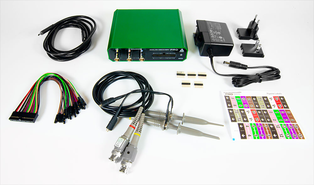 The Analog Discovery Pro (ADP2230)™ is a mixed signal oscilloscope (MSO) designed for professional engineers. It features analog inputs, analog output, and digital I/O, with deep memory buffers all operating at up to 125 MS/s. Users can both receive and generate digital signals to test and analyze data from various devices while simultaneously powering those systems with its robust power supply. The feature-packed design allows the ADP2230 to perform the functions of several test and measurement devices and can replace a stack of traditional instruments.