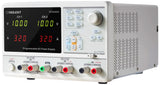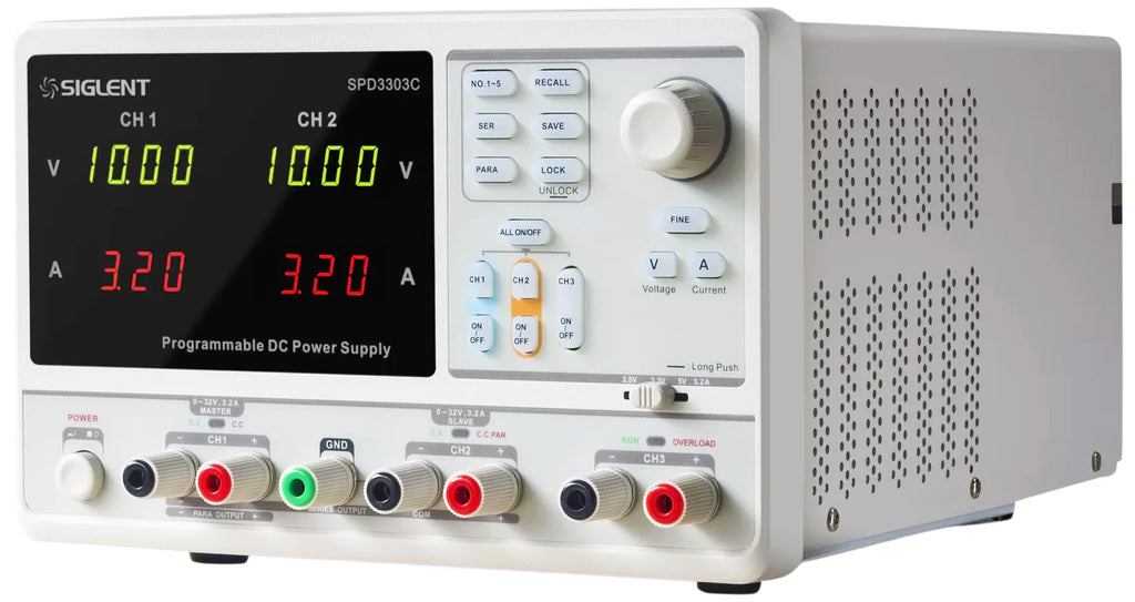 The SIGLENT SPD3303C Programmable DC Power Supply is a LED display screen and programmable linear DC power supply that is both lightweight and feature-packed. It has three independent outputs: two sets of adjustable voltage / current and a fixed set of selectable voltages; 2.5, 3.3, and 5 V. In addition, the SPD3303C DC power supply has outputs that are short-circuit and overload protected. Total power is 220 W. It has three available operation modes; independent, series and parallel modes. The SPD3300C has a high performance-to-price ratio and can be used in various types of production, education and research environments.
