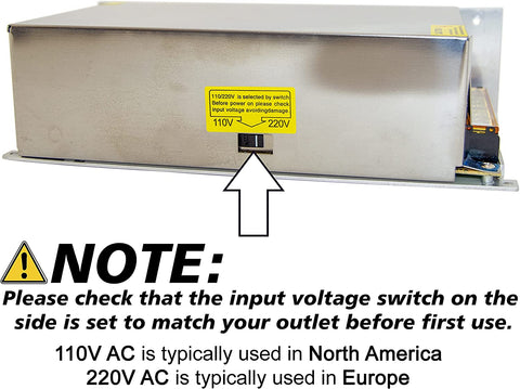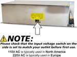 NOTE: INPUT VOLTAGE (110V/220V) MUST BE SELECTED AS NECESSARY USING THE SWITCH ON THE SIDE BEFORE OPERATION. 110V AC is typically used in North America, 220V AC is typically used in Europe.