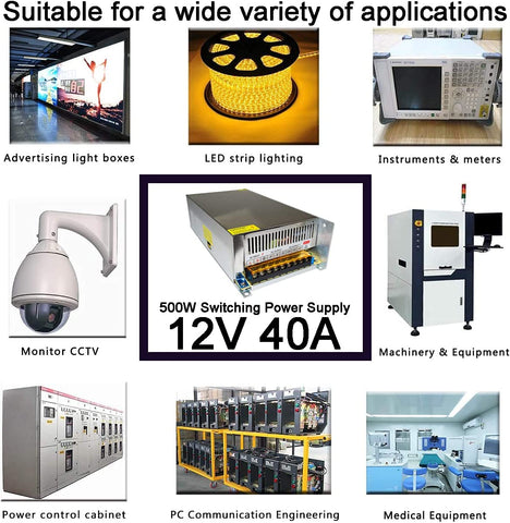 12V 40A 500W Universal Switching Power Supply 110-240VAC to DC12V for LED Strip Lighting, CCTV Cameras, Radios, Electronic Projects, and More