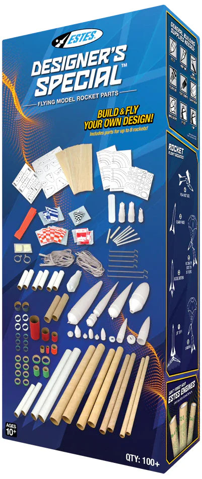 Build and fly your own designs. 100+ useful parts to build up to 8 rockets! Be that “rocket scientist” you’ve always dreamed of being! Just what you’ve been waiting for! A BIG box with truly enough parts to build 8 complete rockets and you still might have some parts left! Here’s your chance to be a rocket designer because you get EVERYTHING you need!