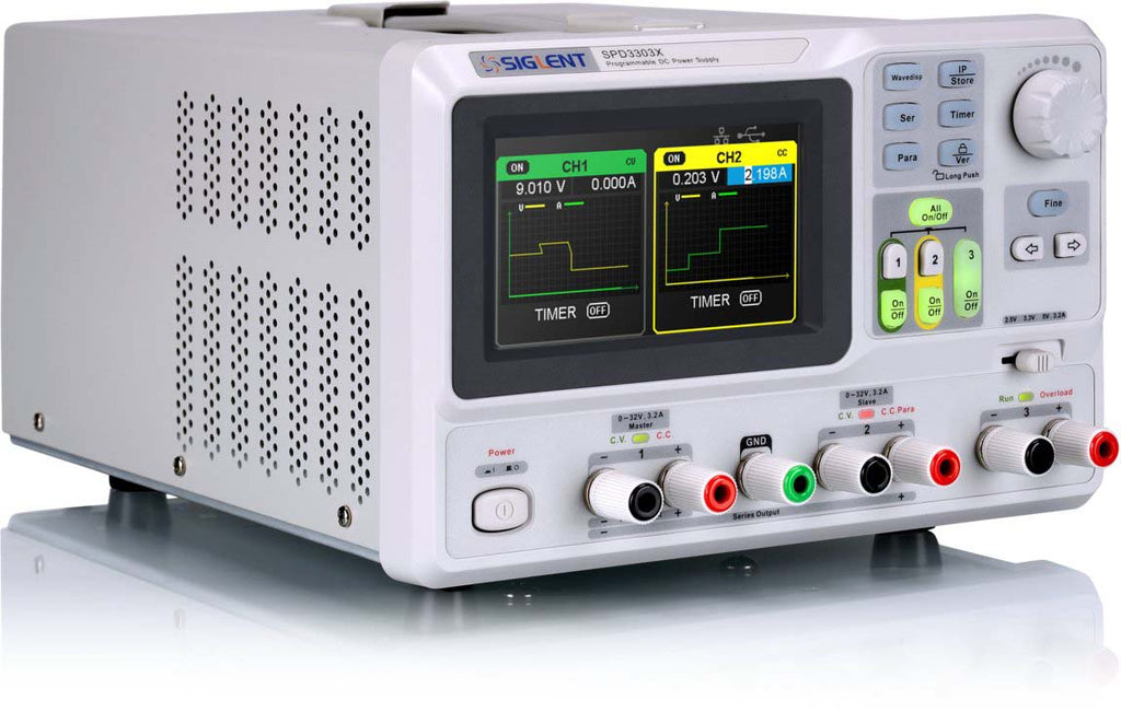 SPD3000X Series Linear Programmable DC Power Supply has a 4.3 inches TFT_LCD display, Supports Programmability and Real Time Wave Display, bringing a new experience to USErs. It has three isolated outputs: two adjustable channels and one selectable channel from 2.5v, 3.3V, and 5V. It also has output short and overload protect function, and can be USEd in production and development.