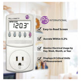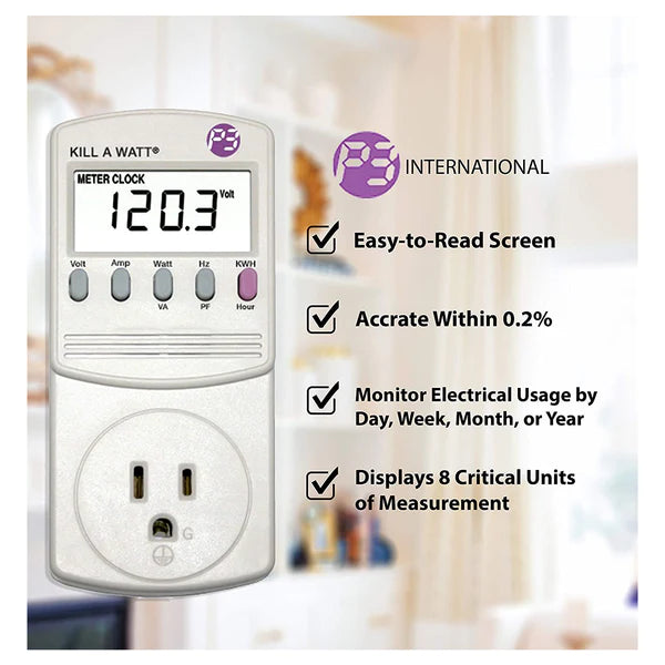 Electricity bills are rising. Now you can cut down on costs and find out what appliances are actually worth keeping plugged in. Simply connect these appliances to the Kill A Watt®, and it will assess how efficient they really are. Large LCD display will count consumption by the Kilowatt-hour, same as your local utility. You can calculate your electrical expenses by the day, week, month, even an entire year. Also check the quality of your power by monitoring Voltage, Line Frequency, and Power Factor. Now you´ll know if it is time for a new refrigerator or if that old air conditioner is still saving you money.