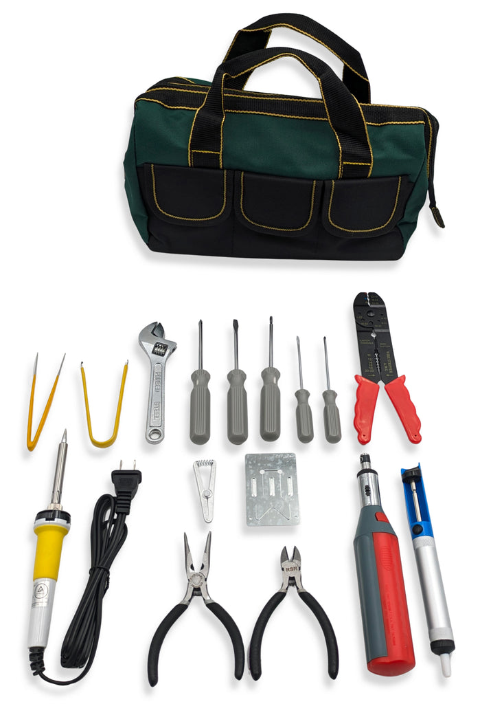 RSR Electrical Engineering Toolkit, Includes 35W Soldering Iron, Solder, Desoldering Pump, Wire Striper Cutter Crimper, Adjustable Wrench, Driver + Bits, Pliers, Tweezers, IC Extractor + Inserter and More