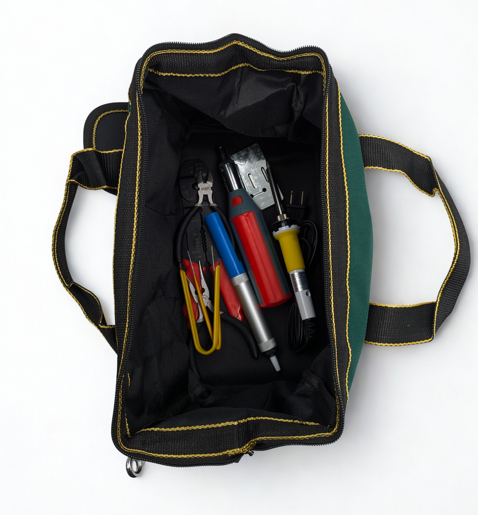 Includes a plethora of electrical engineering essentials - all tools can be stored and carried in a tool bag with 3 velcro pockets and 2 sleeve pockets on the outside.