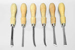 Woodcarving chisel set with elongated sleek, wooden handles. Ideal for beginners working on small projects.
