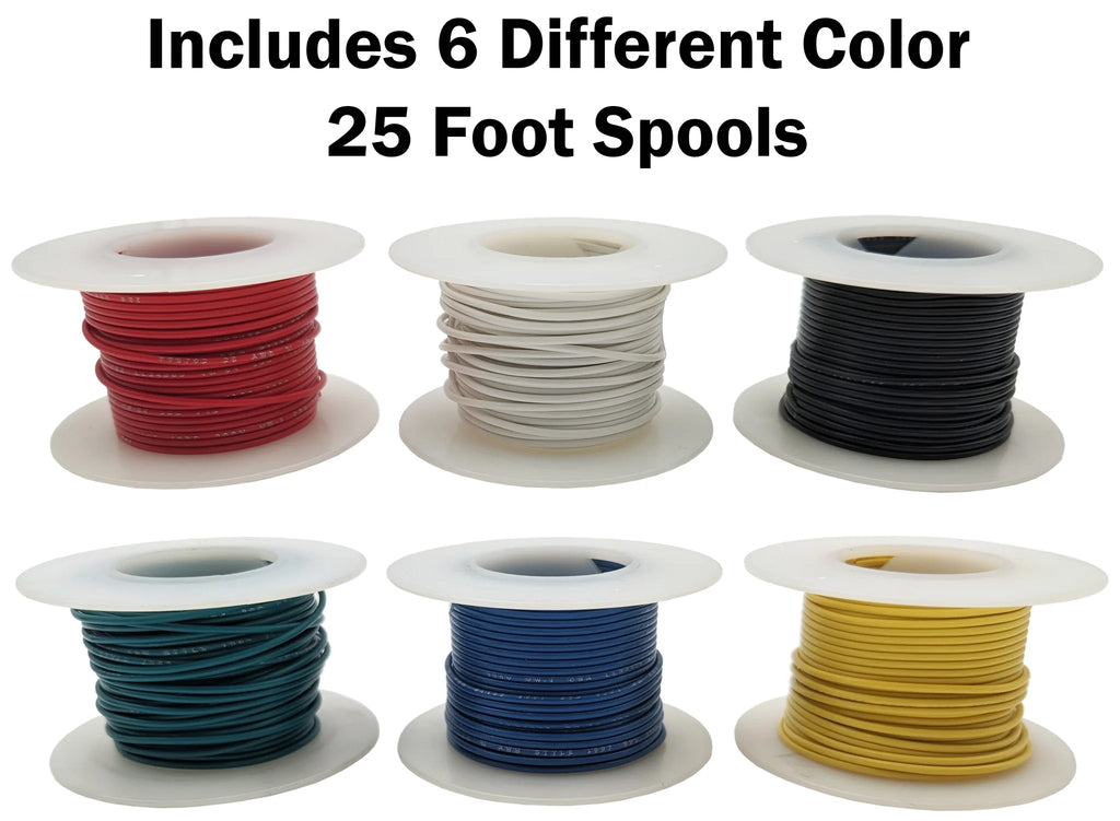 Stranded 26 Gauge Hook Up Wire Kit - Includes 6 Different Color 25 Foot Spools, Tinned Copper, PVC Insulated