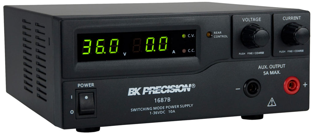 The B&K Precision 1687B switching mode DC power supply provides various configurations of high output voltage or high output current in a small, lightweight form factor. In addition to its constant voltage (CV) and constant current (CC) modes, this high efficiency DC power supply offers a unique preset and remote control modes. Up to three different presets of voltage and current values can be saved for quick recall through a rear switch. For remote control, an analog remote control terminal is accessible on the rear, or use the USB interface to communicate with the power supply via PC software or remote commands. Suitable for a wide range of applications including production testing, telecommunications, R&D, electronic field service, and university labs.