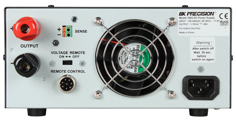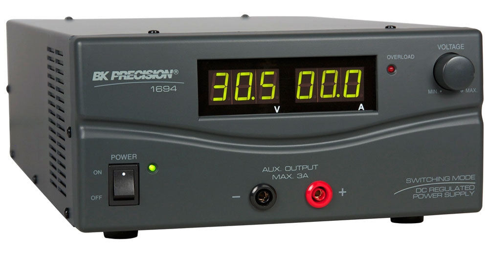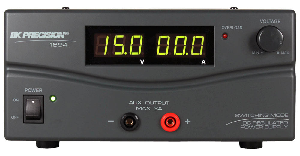 The 169 switching mode DC power supply provide high current output in a lightweight and compact package. Includes a remote sensing terminal to compensate for voltage drop across load leads. The output voltage level can also be externally controlled via an analog remote control terminal. Bright red and green LED displays provide for an accurate and highly readable indicator of settings.