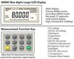 Bench Digital Multimeter with waveform generator and thermometer has a large LCD with high contrast. It also has a wide visual angle LCD display with a white backlight. It has a dual display: The main display 80000 counts, The secondary display 80000 counts, analog bar 21 segments, with unit & function symbols. It has 50 measurement functions including DCV, ACV, DCA, ACA, Ohm, CAP, Hz, TEMP, Diode, Continuity and others. The frequency range is up to 80MHz. The standard function generator has 18 waveforms, 1% to 99% Duty cycle, 1800 pcs wave output. The resistance measurement range: 0.01 Ohm - 80 MOhm. The capacitance measurement range is 10PF - 100uF. The temperature measurement Range: -58°F to 2502°F, - 50°C to 1372°C. Photoelectric isolated RS-232 computer interface. AC measurement - High accuracy RMS, Wide measurement AC+DC function. It also has auto data refresh hold.