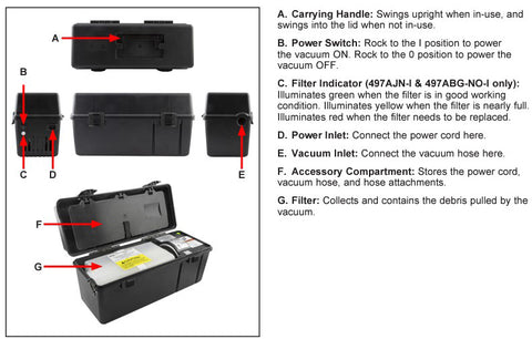 Self-contained vacuum designed for high efficiency cleanup of most business equipment, including removing toner and dust.