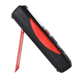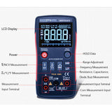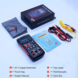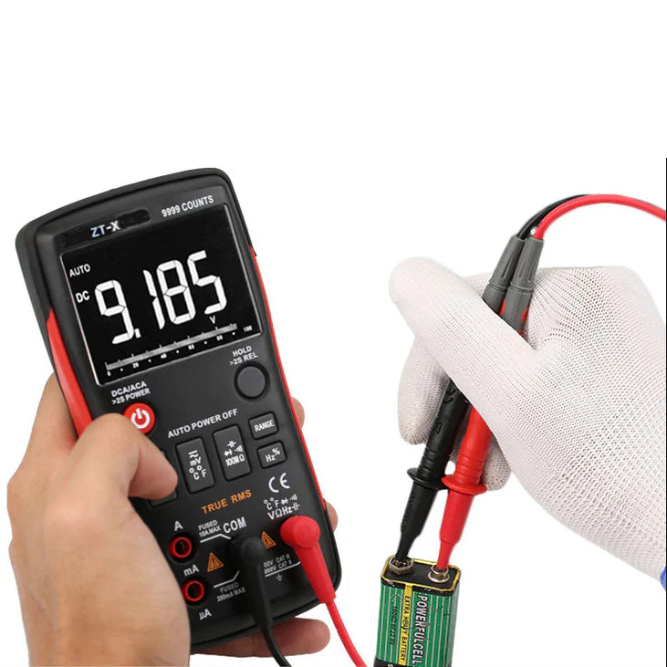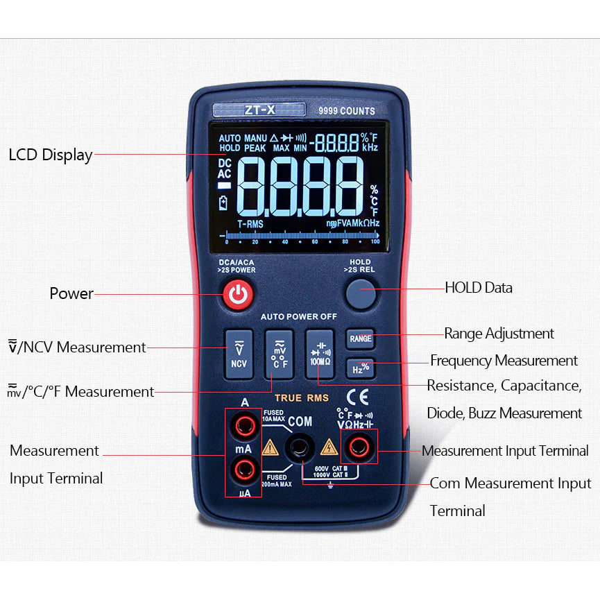 The ZT-X autoranging True RMS NCV multimeter is designed for convenient one-handed operation by using buttons rather than a switch. It tests DC/AC, Resistance, Capacitor, Voltage and Frequency (displayed simultaneously), and temperature in both Celsius and Fahrenheit (displayed simultaneously). Powered by two AA batteries (included) and features a low battery indicator as well as an auto power off feature. The LCD screen has 9999 counts and is backlit. Auto or manual ranging and 3 times per second update rate. The rugged case provides protection against shocks and accidental drops. A collapsible, break-resistant stand holds the multimeter upright.