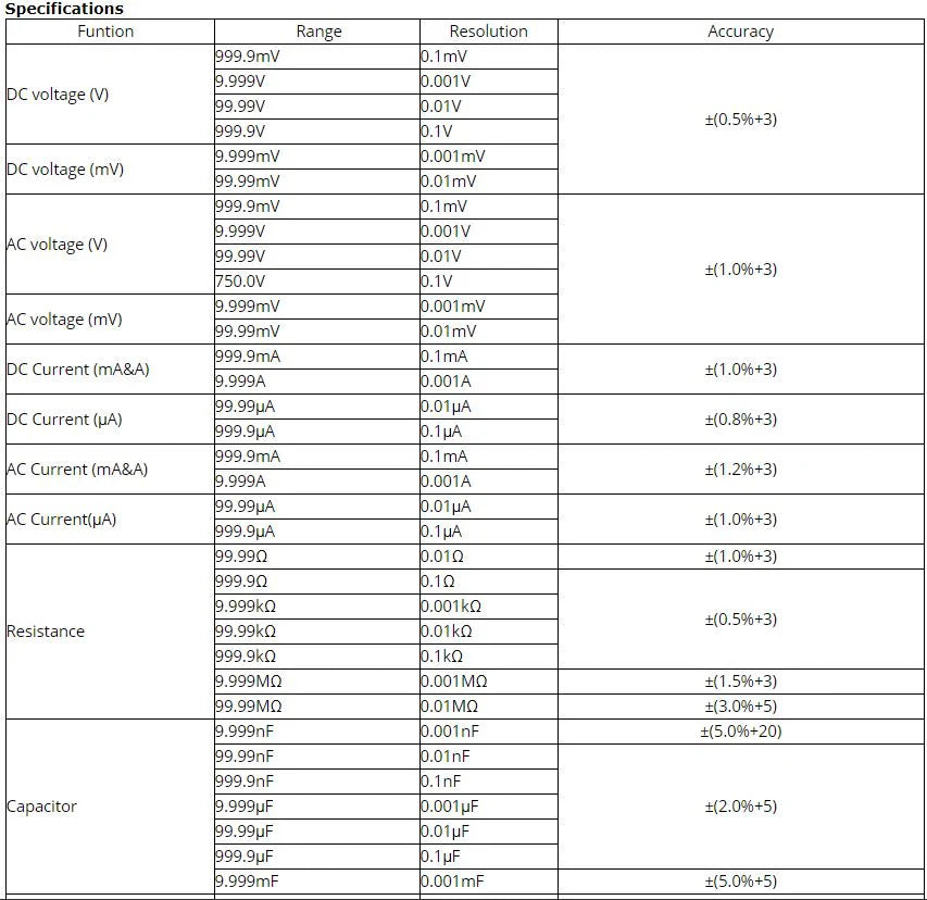 - DC Current: 999.9mA/9.999A ±(1.0%+3); 99.99mA/9999μA±(0.8%+3)