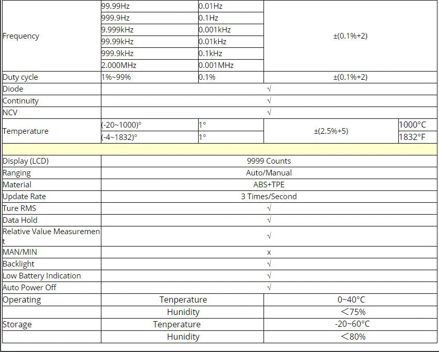 - Frequency: 99.99Hz/999.9Hz /9.999kHz/99.99kHz/999.9kHz/2.000MHz ±(0.1%+2)