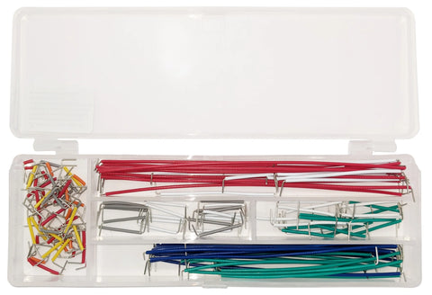 Includes 140 piece jumper wire kit containing assorted lengths and colors in a convenient plastic storage case. Contains wires of the following quantities and sizes:
