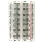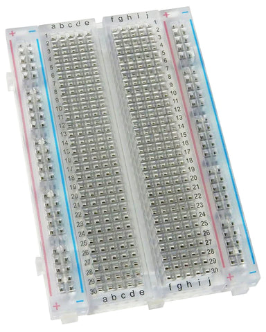 Clear / see-thru making it easier for students to learn prototyping using breadboards. Ideal for testing, prototyping and experimentation. Features a peelable adhesive backing and nickel plated clips. There are 300 contact points on the main board and 50 contacts on each of two removable power distribution strips.