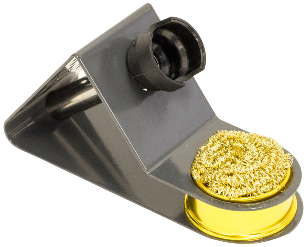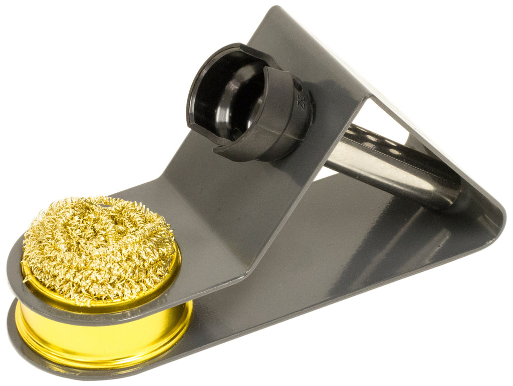 Sturdy and heavy-duty metal soldering iron stand with built-in soft coiled brass tip cleaner. Tip cleaner is made of low abrasive brass shavings that clean soldering iron tips better than conventional sponges. No water is required and it is especially useful for lead-free solder, as tip temperature is kept constant. The stand has 4 rubber feet to prevent the stand from moving. The stand measures 2.4" x 6.5" x 3.7" overall.