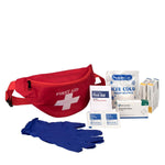 Fanny Pack First Aid Kit.Red canvas bag with minor emergency essentials.Fits around your waist for convenience.Be prepared on the go
