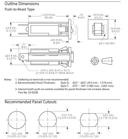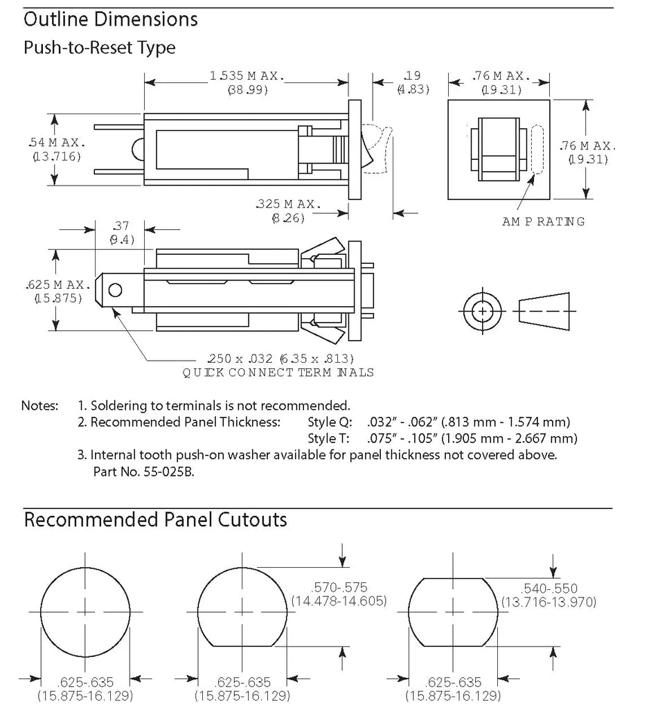 2A Thermal Circuit Breaker, 1 Pole, 250V AC / 32V DC, Snap-in Panel Mount with Push to Reset Actuator (W28-XQ1A-2)