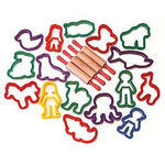 Pack of 20 brightly colored plastic dough/clay cutters. Shapes include Mom, Dad, Son, Daughter, octopus, shark, duck, seal, horse, giraffe, butterfly, alligator, owl, rabbit, camel and gorilla. This pack of 20 also includes four rolling pins.