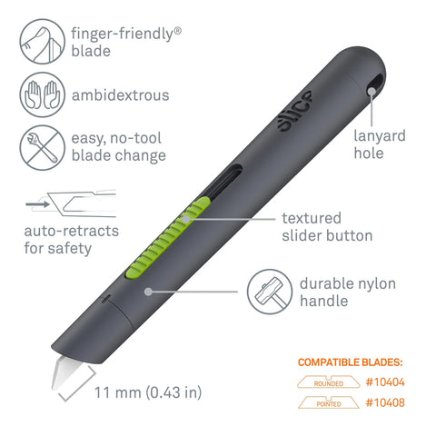 The Slice® Auto-Retractable Pen Cutter allows you to work safely with a versatile tool that fits perfectly in your workforce’s fingers. The cutter’s blade is the safest you’ll find in the workplace. Its unique finger-friendly® blade is safe to the touch and therefore causes fewer and less severe injuries than traditional blades. Your frontline workers are further protected because the textured auto-retractable slider ensures the blade can never be accidentally left out. The reinforced nylon handle is highly durable, making it a great tool for industrial use. While the familiar, sleek shape of a pen means it is comfortable to hold, has universal uses, and is easy to store.